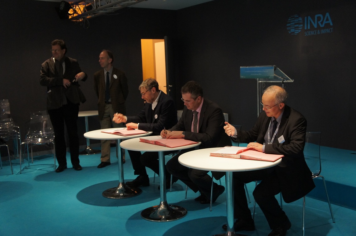 François Houllier, président de l’Inra, Pierre Mutzenhardt, président de l’Université de Lorraine et Gilles Trystram, président de l’Institut des Sciences et Industries du Vivant – AgroParisTech ont signé un accord visant à construire en Lorraine un pôle européen de recherche, de formation et d’innovation dans les domaines « Forêt, Bois et Territoires » et « Agro-alimentaire ». La signature a eu lieu dans le cadre du Salon international de l’agriculture jeudi 27 février 2014.