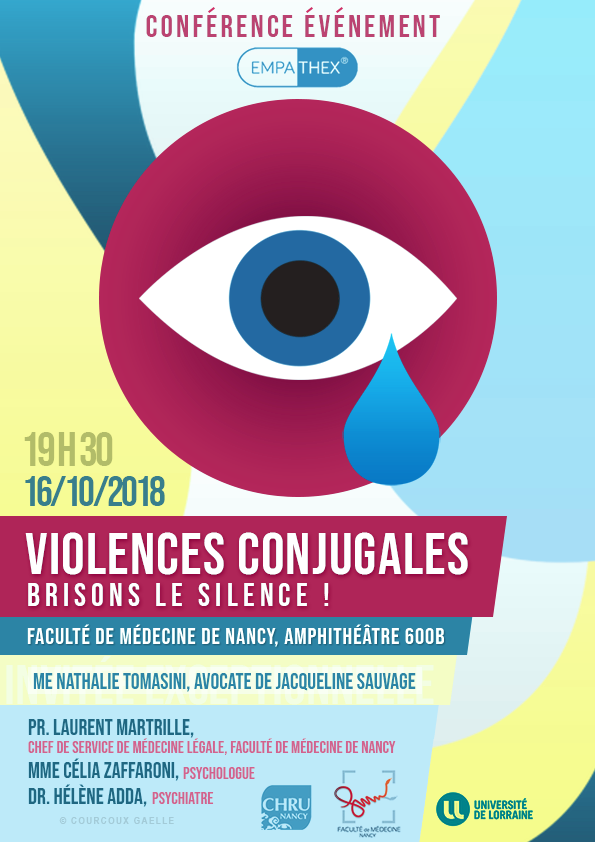 Chaque année, en France, 225 000 femmes sont victimes de violences physiques et/ou sexuelles de la part de leurs conjoints. En 2016, ce sont 123 femmes, 34 hommes et 25 enfants qui sont décédés des suites de violences intrafamiliales. Une conférence événement sur ce sujet sera donnée par l'association Empathex, mardi 16 octobre, à la Faculté de Médecine de Nancy, amphithéâtre 600B, à 19H30.
