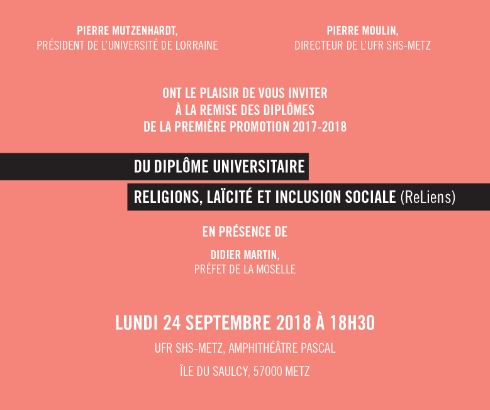 Ce lundi 24 septembre à 18h30 (Amphi Pascal de l’UFR SHS-Metz), les 21 stagiaires de la première promotion du DU ReLiens seront mis à l’honneur lors d’une cérémonie de remise des diplômes qui se déroulera en présence de Didier Martin, préfet de la Moselle.