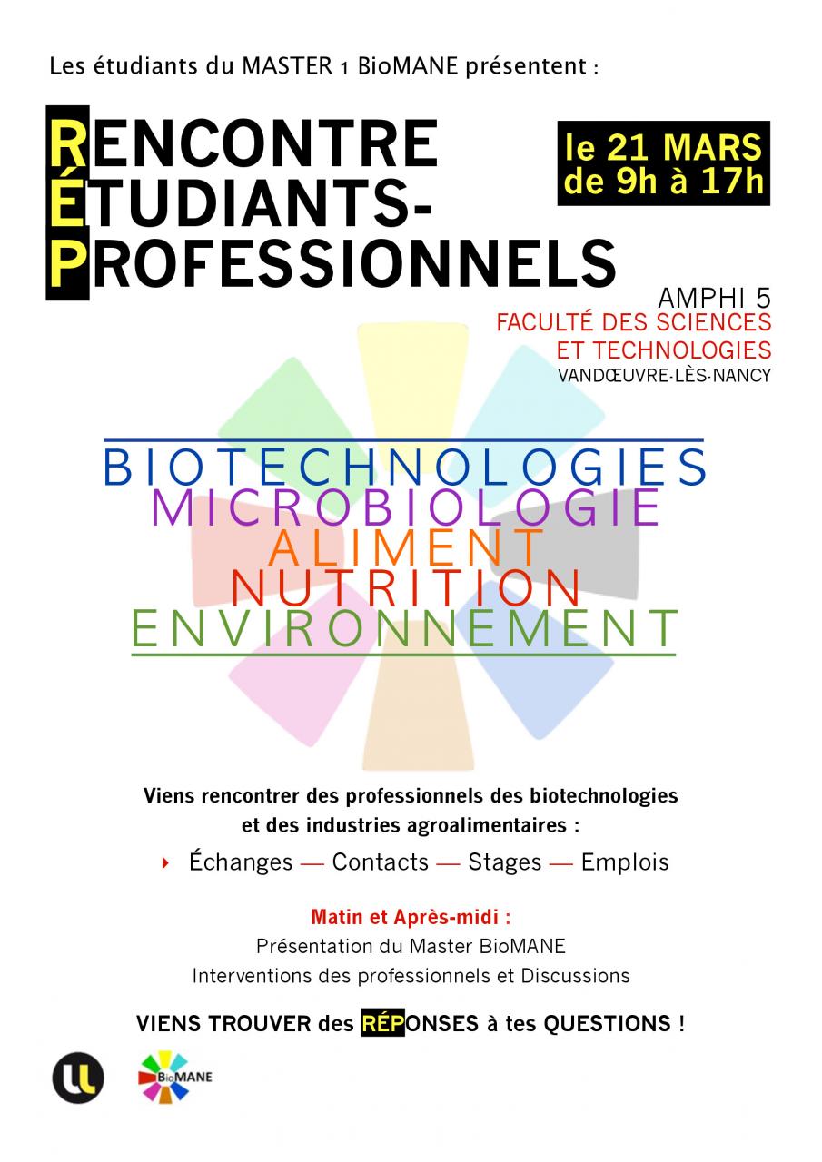 Le vendredi 21 Mars 2014 les étudiants du master Biotechnologies Microbiologie Aliment Nutrition Environnement (BioMANE) organisent une rencontre étudiants-professionnels. Les secteurs de la biotechnologie et de l'agroalimentaire seront représentés ce jour là.
