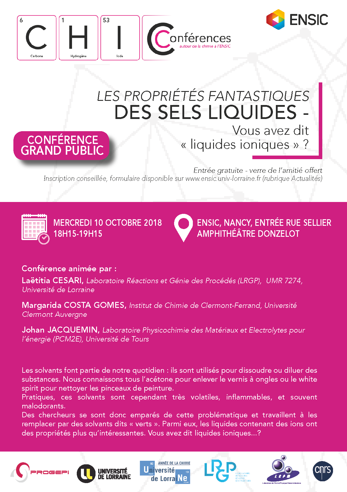 Dans le cadre de l’opération « 2018 - 2019 : Année de la Chimie de l’école à l’Université » lancée par le ministère de l’Education nationale et le ministère de l’Enseignement supérieur, de la Recherche et de l’Innovation, l’ENSIC s’associe à Progepi & aux laboratoires du site Grandville pour proposer un cycle de conférences grand public : les Conférences CHIC. Gratuites, ces conférences ont pour objectif de présenter au grand public un aspect du génie des procédés et génie chimique, en adoptant une démarche de vulgarisation scientifique semblable aux conférences TedX.