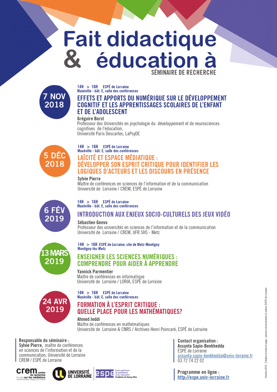 5 rencontres sont proposées cette année dans le cadre de ce séminaire de recherche qui se déroule à l’ESPÉ de Lorraine (sites de Nancy-Maxéville et Metz-Montigny). Il permet aux chercheurs, confirmés et débutants, chercheurs associés et doctorants de l’unité de recherche de présenter des travaux en cours et de les discuter, mais aussi d’accueillir des chercheurs extérieurs à l’équipe.