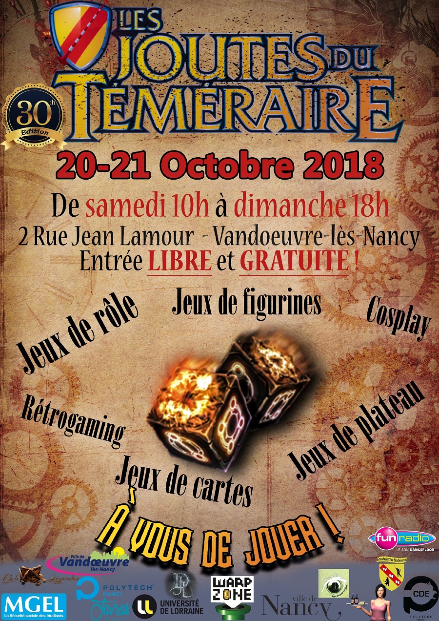 La 30e édition des Joutes du Téméraire, grand Festival de Jeux à entrée libre organisé par les étudiants de Polytech Nancy, aura lieu les samedi 20 et dimanche 21 octobre sur le site de l'Ecole à Vandoeuvre lès Nancy. Cette année, le thème des Joutes sera sur l'univers de la Fantasy.