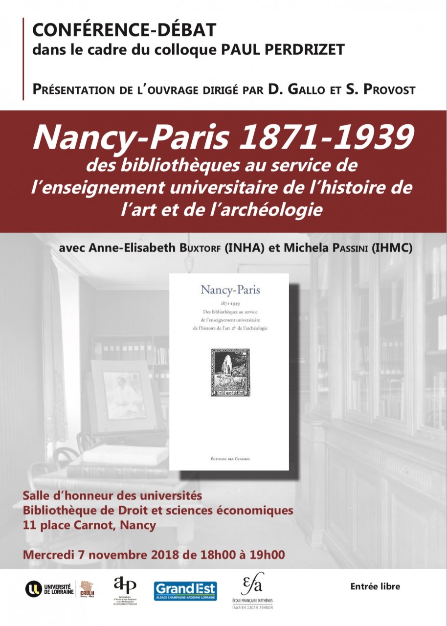 Conférence-débat, le mercredi 7 novembre, 18h00-19h00, salle d'honneur des universités (11, place Carnot, Nancy) autour de l'ouvrage dirigé par Daniela Gallo et Samuel Provost, Nancy-Paris 1871-1939, des bibliothèques au service de l'enseignement de l'histoire de l'art et de l'archéologie, (Paris, éditions des Cendres, 2018),