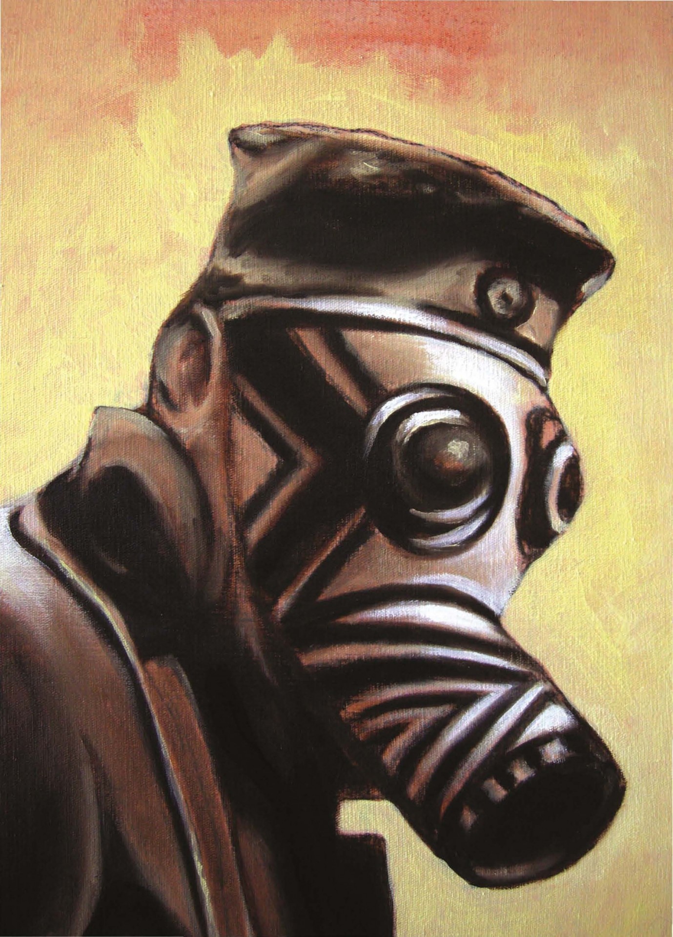 Ensuite mon travail a évolué vers la condition anonyme du soldat pris dans les combats. Je me suis alors intéressé aux masques à gaz qui furent utilisés pour la première fois sur les fronts de la première guerre mondiale. L’intérêt au recours du masque à gaz dans mes peintures apporte une puissance visuelle ; j’estime que cela donne une certaine idée de l'horreur de la guerre et ça permet aussi de rendre anonyme celui qui le porte. J'ai eu l'idée de mettre en parallèle, sur la même image, le masque à gaz et le masque africain. Partant de photos de soldats avec des masques à gaz, j'ai voulu confronter plastiquement le masque africain avec les différents types de masque à gaz de la première guerre mondiale. Le résultat est une série de grandes peintures à l'huile figuratives de format vertical et de ton monochrome. La teinte est obtenue avec une palette restreinte faite de quatre couleurs : de la terre d'ombre brûlée, du rouge de cadmium pâle, du jaune de Naples et du blanc de zinc.