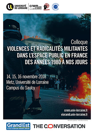 Violences et radicalités militantes dans l’espace public en France des années 1980 à nos jours * Le colloque « Violences et radicalités militantes dans l’espace public en France des années 1980 à nos jours » (Vioramil, 14-16 nov 2018) prend place dans le programme éponyme, sélectionné et financé par l’Agence nationale de la recherche (ANR), qui a commencé en 2016 et s’achèvera en 2019. Le site http://vioramil.univ-lorraine.fr/ en fournit une présentation détaillée.