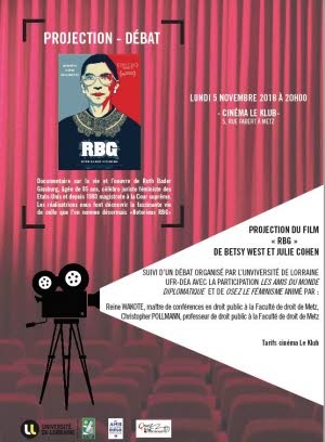 Documentaire de Betsy West et Julie Cohen (1h 38 min.) sur la vie et l'oeuvre de Ruth Bader Ginsburg, âgée de 85 ans, célèbre juriste féministe des Etats-Unis et depuis 1993 magistrate à la Cour suprême, suivi d'un débat avec Reine Wakote, maître de conférences en Droit public à la Faculté de droit de Metz, et Christopher Pollmann, professeur à l'Université de Lorraine.