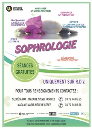 Des séances gratuites de sophrologie sont proposées aux étudiants de l'Université de Lorraine. Elles se déroulent au Service universitaire de médecine préventive et de promotion de la santé (SUMPPS) sur les sites du Vélodrome à Vandoeuvre-lès-Nancy et sur le campus Lettres et sciences humaines à Nancy. Si vous êtes intéressé, merci de prendre rendez-vous au 03 72 74 05 65.