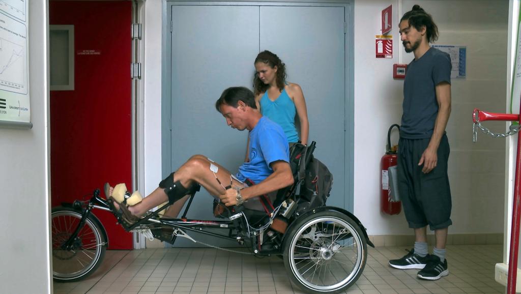 Marina Julienne : Nous avons suivi, avec le co-réalisateur Raphaël Girardot, une équipe de chercheurs de l’ENS de Lyon qui est dirigée par le physicien Vance Bergeron. Il a eu un accident de vélo il y a quelques années, est devenu tétraplégique et il a réorienté l’activité de son laboratoire sur les aides technologiques pour les handicapés. Il a recruté 3 personnes tétraplégiques comme lui pour participer à la première compétition internationale pour athlètes handicapés équipés de prothèses bioniques, le Cybathlon, qui avait lieu à Zurich en 2016.. Nous sommes restés en immersion dans son laboratoire pendant 6 mois, le temps de la préparation et de l'entrainement pour cette compétition. Sachant que lui et son équipe s’entrainait surtout sur la stimulation électrique fonctionnelle : le principe est de placer des électrodes sur les jambes des personnes paralysées, puis d'envoyer des impulsions électriques qui leur permettent à nouveau de pédaler.