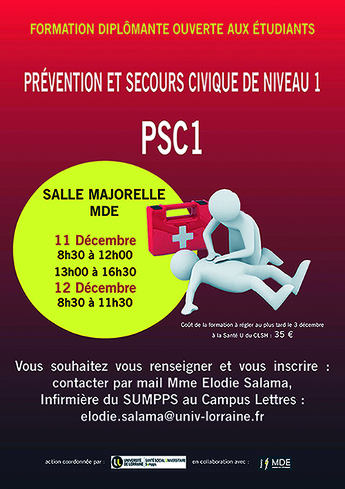 Le SUMPPS et la Maison De l'Étudiant Nancy (MDE Nancy) proposent aux étudiants intéressés une session de formation aux gestes de premiers secours (PSC1). Cette formation se déroulera sur trois demi-journées dans la salle Majorelle de la MDE : le mardi 11 décembre de 8h30 à 12h00 (pause déjeuner) reprise à 13h00 jusqu'à 16h30 / le mercredi 12 décembre de 8h30 à 11h30. Le nombre d'étudiants par session est de 10, et la participation à la totalité des heures est nécessaire pour valider le diplôme. Cette formation diplômante vous demande une participation financière avantageuse.