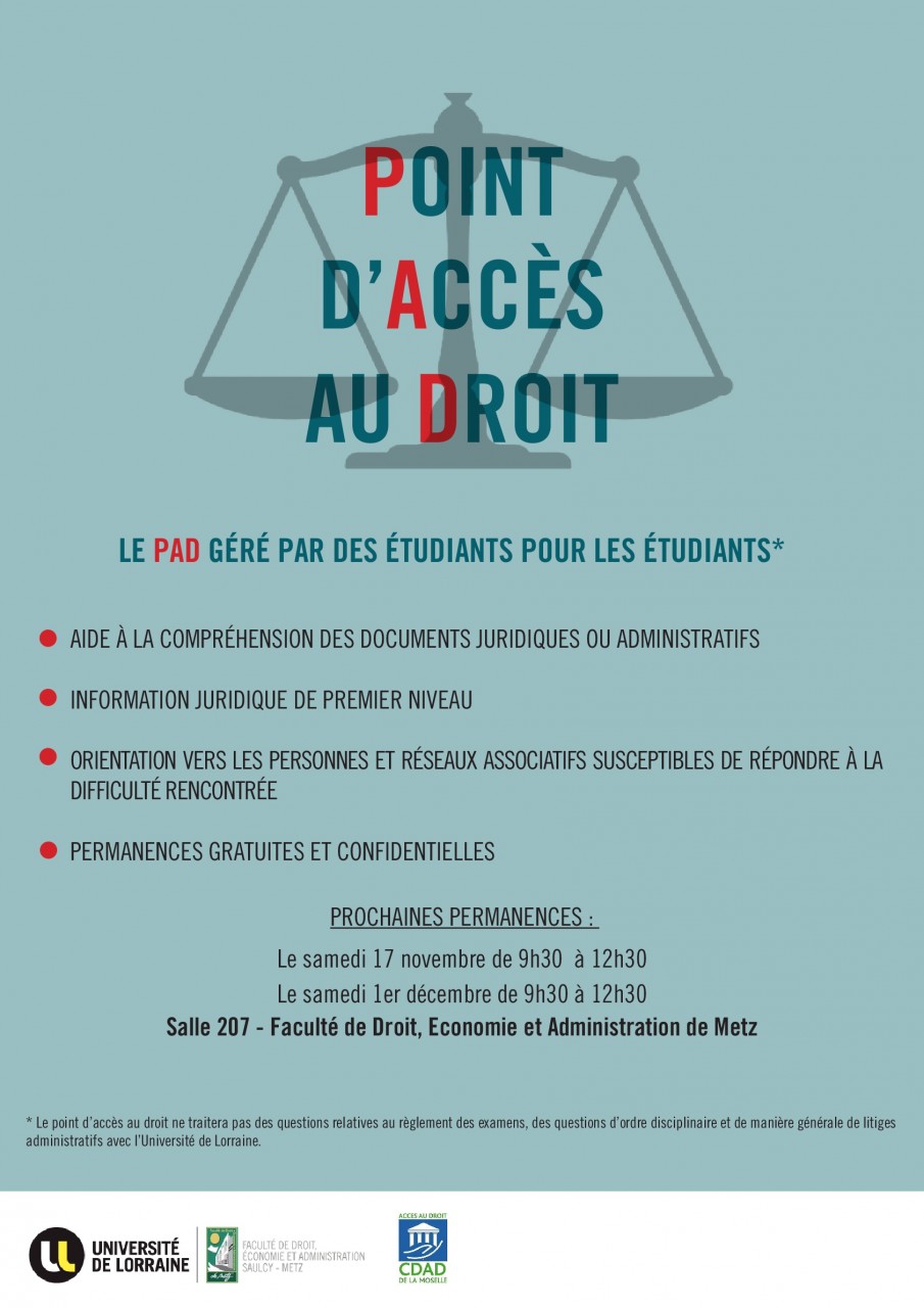 La faculté de droit, économie et administration de Metz présente le premier Point d'Accès au Droit (PAD) géré par des étudiants en droit pour les étudiants.