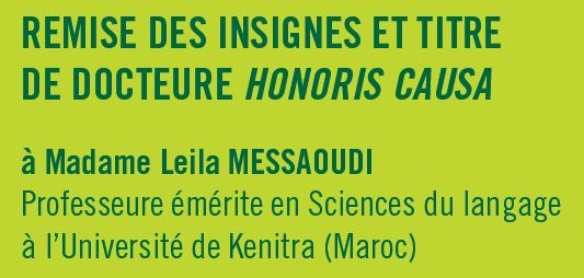 Le 10 décembre 2018 seront remis les insignes et titre de docteure honoris causa à Leila Messaoudi, professeure émérite en sciences du langage à l'Université de Kenitra (Maroc). Cette cérémonie sera suivie d'une conférence de Leila Messaoudi : Les défis sociétaux de la sociolinguistique aujourd'hui.