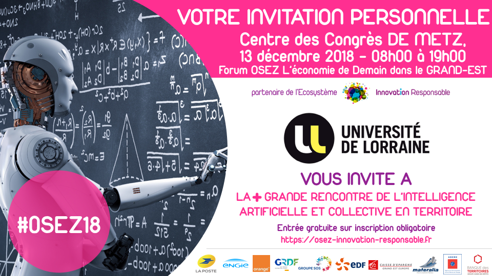 L'évènement annuel «Osez l’économie de Demain #OSEZ18» est organisé cette année le 13 décembre 2018 au Centre des Congrès Robert Schuman à Metz avec l’ambition d’être la plus grande manifestation de l’ « Intelligence Artificielle & Collective » en territoire du Grand Est. A l’occasion de cet évènement d’envergure nationale, les thématiques suivantes seront abordées autour d’un village Entreprises, d’un plateau TV Live, de Conférences prospectives et de moments de networking & de convivialités, sur plus de 2 000 m2 :