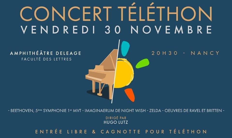Le premier concert de l'année aura lieu à la fin du mois. Un concert caritatif (et gratuit !) en faveur du Téléthon qui se déroulera à l'amphithéâtre Déléage de la faculté de lettres de Nancy. Et premier concert signifie nouveau programme ! Alors venez nombreux découvrir les nouvelles œuvres que nous vous avons préparées avec notre nouveau chef, Hugo Lutz.