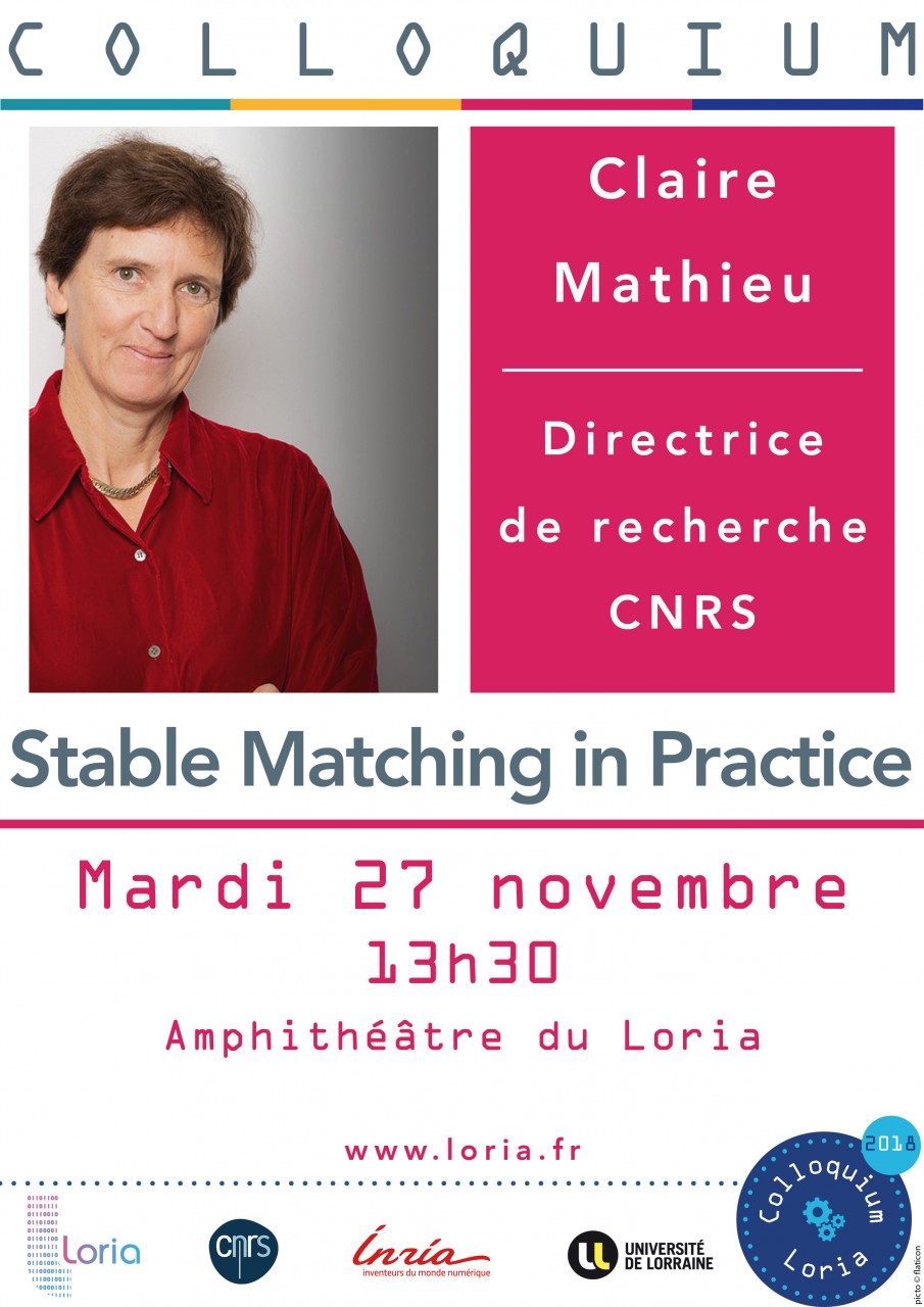 Rendez-vous le mardi 27 novembre à 13h30 dans l'amphithéâtre du Loria pour son exposé intitulé "Stable Matching in Practice".