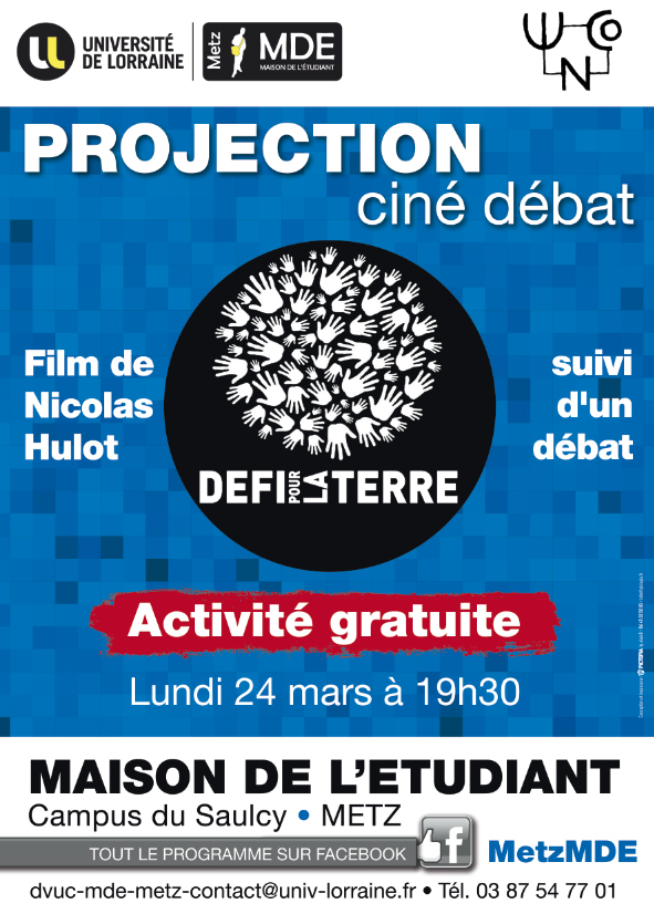 Le film "un défi pour la terre" de Nicolas Hulot sera projeté et sera suivi d'un débat avec la participation de Madame Fointiat et de Monsieur Bastien, Professeurs des Universités en SHS.