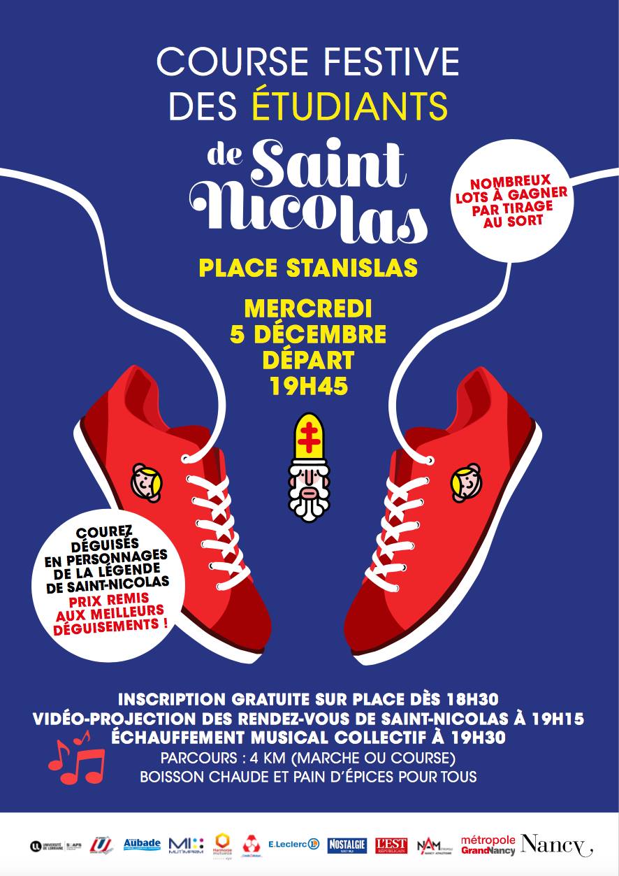 Le SUAPS de l'Université de Lorraine organise, en partenariat avec la LGESU (Ligue Grand Est du Sport Universitaire) et le NAM (Nancy Athlétisme Métropole), la course universitaire de la saint Nicolas le mercredi 5 décembre 2018.