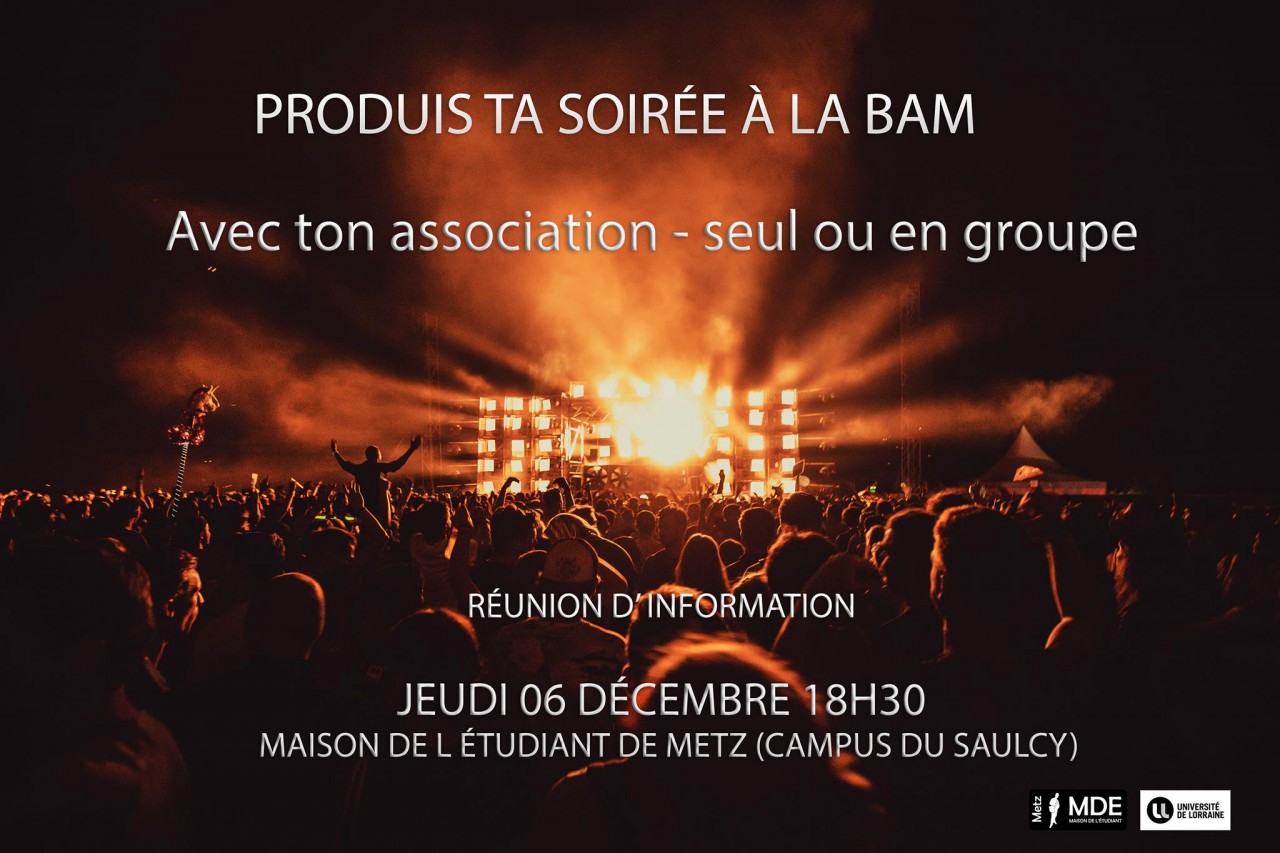 La cité musicale de Metz et l’Université de Lorraine s’associent pour t’offrir la possibilité d’organiser un énorme évènement à la BAM. Avec ton association, seul ou en groupe, rejoint le collectif qui se créera le jeudi 06 décembre à 18h30 à la Maison de l’étudiant de Metz (campus du Saulcy) afin de produire cette soirée mémorable. Tu auras :