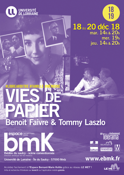 La découverte d’un album photos conduit deux artistes à mener une enquête palpitante sur les traces de la vie de Christa, née en 1933 en Allemagne. Le point de départ de ce spectacle est un album photos acheté dans une brocante en Belgique. Celui-ci a incité Benoît Faivre et Tommy Laszlo à mener une enquête qui les conduit à Berlin, à Francfort, à Bruxelles, et jusque dans leur propre histoire familiale. Leur but ? Découvrir qui est la femme dont la vie est contenue dans cet album et comprendre pourquoi cet objet les touche autant. Des réminiscences et des coïncidences jalonnent ce voyage initiatique dans la mémoire. Sur le plateau, les deux artistes s’adressent directement au public, et retracent les étapes de leur périple à l’aide de photographies agrandies par un rétroprojecteur, de films de leur road-trip et d’interviews vidéo de témoins rencontrés. Apparaissent alors le portrait en pointillés d’une inconnue et des destins marqués par la Seconde Guerre mondiale. Avec Vie de Papier, La Bande Passante interroge le processus qui transforme le passé en souvenir, et la transmission de la mémoire.