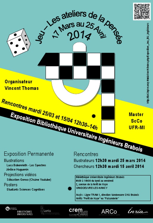 Rencontre avec l'illustrateur Luca Bobenrieth et l'association Les Spectres, mardi 25 mars de 12h30 à 13h30 à la BU Ingénieurs Brabois, dans le cadre de l'exposition "Jeu - Les Ateliers de la pensée", organisée par Vincent Thomas dans le cadre du Master 2 Sciences cognitives et présentée initialement à la Bibliothèque universitaire de Lettres, en 2013.